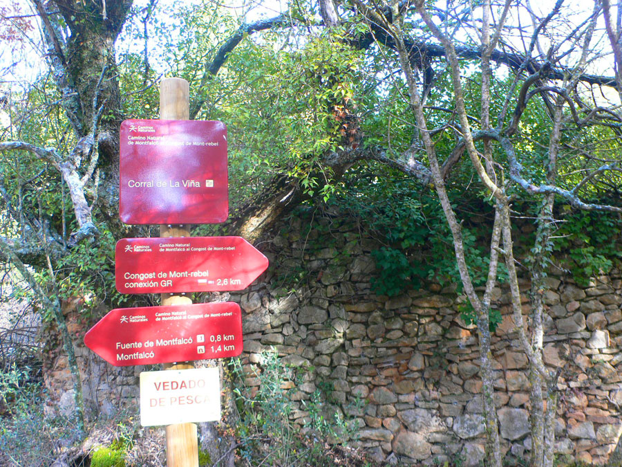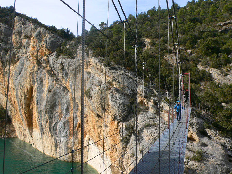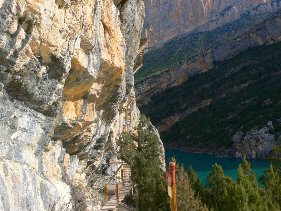 El Montsec siempre ha sido un lugar ideal de escapada para practicar senderismo. Con el congost de Mont-rebei como estrella se articulan toda una serie de senderos a los que sólo les faltaba una cosa, unir Catalunya y Aragón separadas desde la construcción del embalse de Canelles. Con la recuperación de este camino natural que sigue las trazas de la senda que bajaba a la fuente de Montfalcó, la equipación de las pasarelas escalonadas y el puente colgante se ha conseguido este objetivo largamente reivindicado.