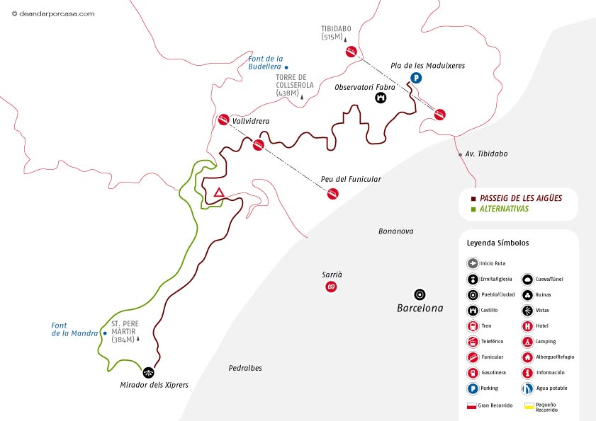 Se trata de un camino totalmente llano que rodea el norte de la ciudad por Collserola y nos ofrece las mejores panorámicas, incluso en días de poca visibilidad. Una opción interesante es recorrer el camino de noche, cuando Barcelona ofrece su mejor cara (obligado frontal). No es posible perderse. Sólo una bifurcación a mano derecha, que nos lleva al Tibidabo nos podría desviar del camino. Nosotros continuamos de frente siguiendo el perfil de la montaña con sus balcones naturales desde los que observamos de cerca la zona alta, La Bonanova, Sarrià y Pedrables, y a lo lejos el skyline barcelonés, modificado por la Torre Agbar y las construcciones del Fòrum. Ya en Esplugues de Llobregat el 'Mirador dels Xiprers' marca el final del 'Passeig de les Aigües'.