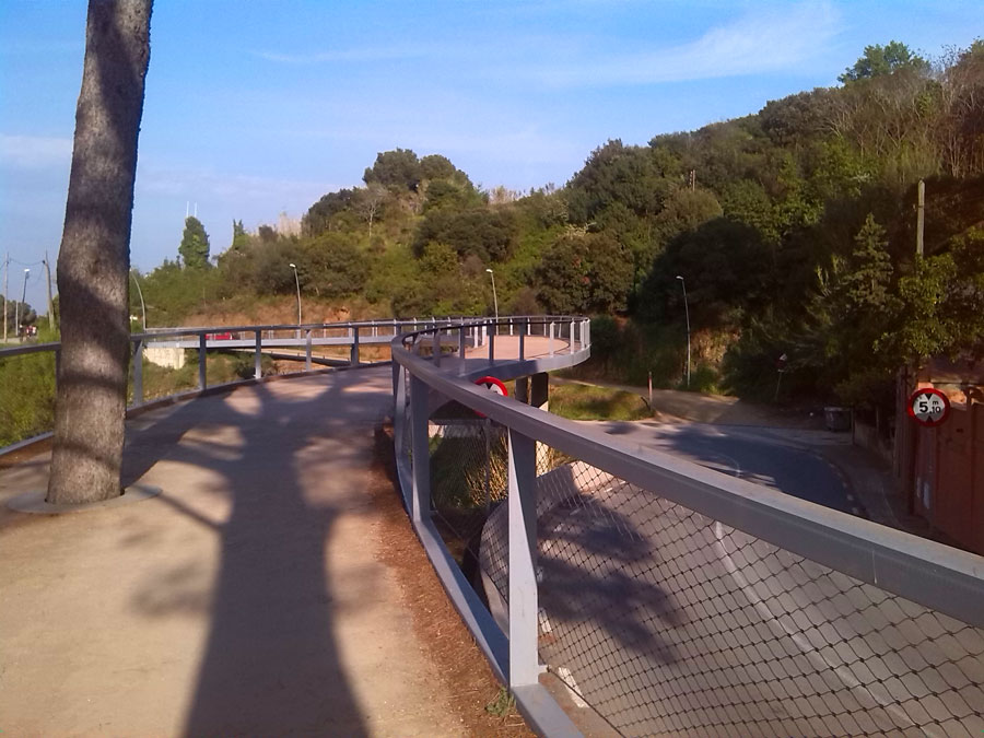 Desde el puente que supera el río Besòs bajaremos paralelos hasta cruzar las vías del tren por un túnel muy bajo. Seguiremos a la izquierda y respetando el sentido de circulación torceremos a la derecha para ir a buscar la calle del Reixagó una rambla que seguiremos a la izquierda. Al final de la calle llegaremos a un paso estrecho con firme irregular y de tierra -acondicionado con buen firme, luces y bancos el 2016-, entre las vías de tren y la canalización abierta del Rec Comtal.