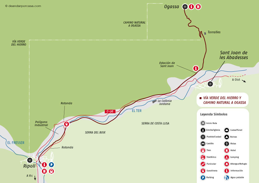 Capital de la comarca del Ripollès y lugar de confluencia de los ríos Ter y Fresser, Ripoll nos ofrece “la ruta del ferro”, antigua vía de tren acondicionada para ciclistas y caminantes que llega hasta Sant Joan de les Abadesses. Rodeados de altos picos, extensos prados, masias, bosques de pinos y robles, la vía completamente asfaltada sigue el curso del río Ter en un trazado sin desnivel.