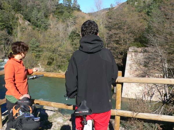 Luego mas adelante hay que cruzar otra vez el río en un lugar que debería haber un puente, y de estar esta!! pero no como debería, la verdad que hay tramos de puente de madera tirados por el río y lo peor es que allí el agua cubre jaja, en algunos puntos el agua tiene una altura aproximada de un metro, pero gracias a unas piedras y a un árbol caído, se puede pasar sin mojarte mas de las rodillas jajaja, no es broma, es una ruta para hacerla en verano debido al frío, a la altura de Navas, el camino desaparece gracias a las zarzas y las ortigas, con lo que nos bajamos de la bici y la usamos para abrirnos camino, al no poder seguir mas, cogimos la carretera y seguimos el camino hasta Balsareny por carretera, ahí seguimos ya por carretera a Sallent, Cabrianes y llegada a Sant Fruitos Del Bages.