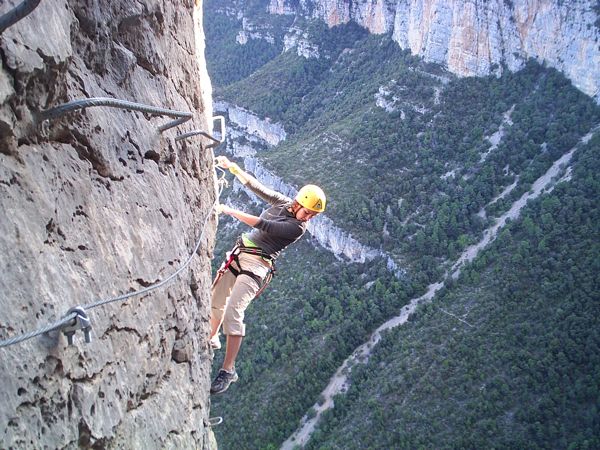Una vía ferrata es un itinerario mayormente vertical equipado con diverso material, desde sencillas clavijas a sofisticados puentes y tirolinas, con la finalidad de permitir las sensaciones verticales y el acceso a zonas difíciles a los no habituados a la escalada. La seguridad corre a cargo siempre del cable de vida, un cable de acero instalado durante todo el recorrido en el que se asegura el equipo disipador.
