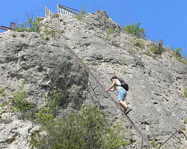Corto paso apto para todos los públicos equipado con tres escaleras de hierro y unas grapas de vía ferrata hasta la cima del Capluc, mirador natural de las Gorgas del Tarn y de la Jonte.