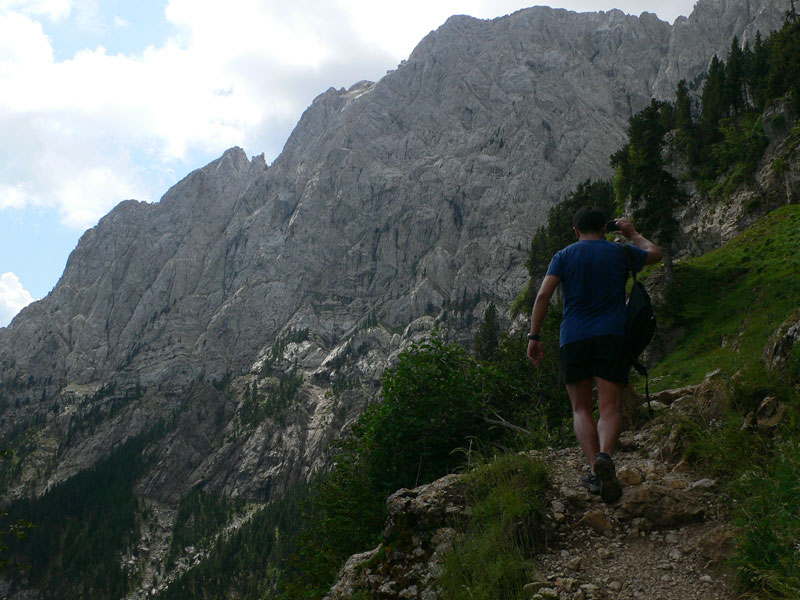 Para la primera parte de la excursión nos servimos de la señalización de los senderos locales, el PRC-123 -marcas amarillas y blancas-. Es una arteria senderista que permite dar una vuelta al macizo del Pedraforca. Sube desde el refugio de Lluís Estasen hacia el collado de Verdet, baja hasta la población de Gósol y vuelve de nuevo al refugio cruzando por la misma -enforcadura-. El PR será nuestra referencia durante la subida desde el refugio -y también de regreso-. Los primeros 576 metros de desnivel los haremos por este sinuoso camino con las paredes de la cara norte del Pedraforca a nuestra izquierda. Encontraremos los primeros obstáculos al cruzar la canal de Riambau que baja tortuosa de la cima del Pedraforca y haremos las primeras fotos cerca de la Bauma de la Rua Gran un estético balcón con buenas vistas.