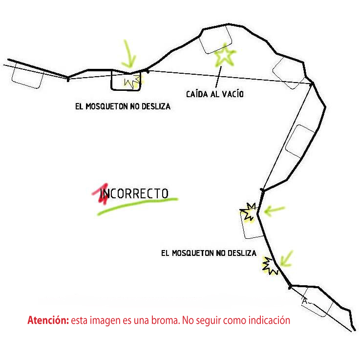 He leído con atención este fantástico trabajo con toda su carga de sarcasmo e ironía sobre la seguridad de las vías equipadas y, aunque os habéis esforzado al dejar claro que las ilustraciones y comentarios son una broma, algunas personas se pueden sentir confundidas, máxime cuando hoy en día es tan sencillo copiar y pegar información gráfica obviando por voluntad o sin ella las citas que dejan claro que es sólo una broma.