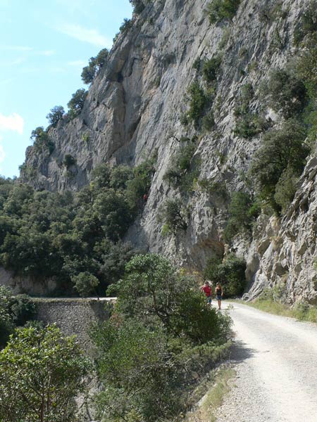 Cruzaremos la riera por varios pequeños puentes, pasaremos por la zona de escalada, bastante popular por sus buenas vías y llegaremos al primer desvío, El pont d'en Valentí. Aquí el camino se bifurca, cruzando el puente andaremos junto a la riera, si seguimos de frente, avanzaremos un poco más apartados, pero al final llegaremos al mismo sitio. Los senderos se pueden combinar para hacer un bucle y así no repetir ida y vuelta. Aunque hay muchos pequeños caminos que nos pueden despistar la ruta tiene muy buena señalización, pues comparte un trozo del popular GR-11 (Gran recorrido del Pirineo) y dispone de nuevas indicaciones gracias al trabajo de Itinerannia