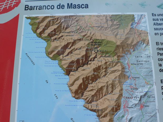 El inicio de la excursión se encuentra en la parte baja de la población de Masca. Llegamos a ella por la vertiginosa carretera de curvas TF-436 que sale de Santiago del Teide. Dejamos el coche en un aparcamiento habilitado en la carretera a la entrada de Masca.