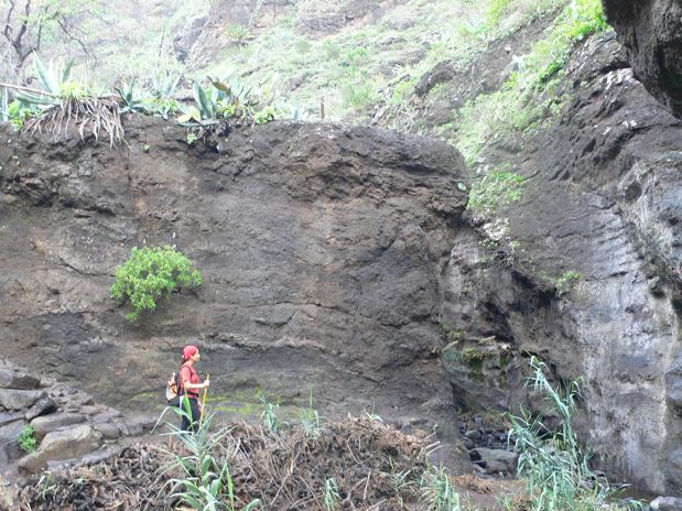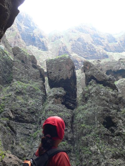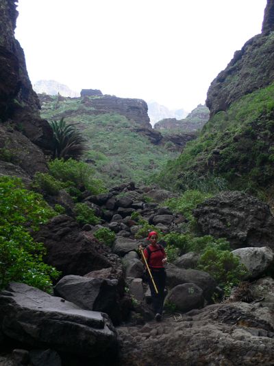 Contempladas las premisas ya podemos entrar en el profundo barranco de Masca, donde nos espera un ambiente muy especial, contundente y de apariencia hostil e incluso intimidante. Altas paredes de piedra volcánica conforman un paisaje duramente transformado por los elementos, repleto de rincones espectaculares que nos hacen sentir insignificantes. En algunos puntos caminamos de puntillas para pasar inadvertidos y no molestar a 'nadie', es fácil transportarse a épocas remotas e imaginarse en otro mundo...