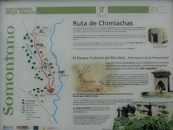 Los puntos de interés son variados, primero veremos las Balsas de Basacol, antiguas balsas que guardaban el agua potable usada en Alquézar y actual zona de picnic para toda la familia. También nos iremos cruzando con pequeñas cabañas de pastor, refugios de piedra preparados para las inclemencias meteorológicas, hasta llegar a los Abrigos de Quizans que atesoran pinturas de estilo esquemático prehistórico y son el preludio del preciado Ciervo de Chimiachas. Como apunte decir que el conjunto de abrigos del cañón del Vero son Patrimonio Mundial por la Unesco desde 1998.