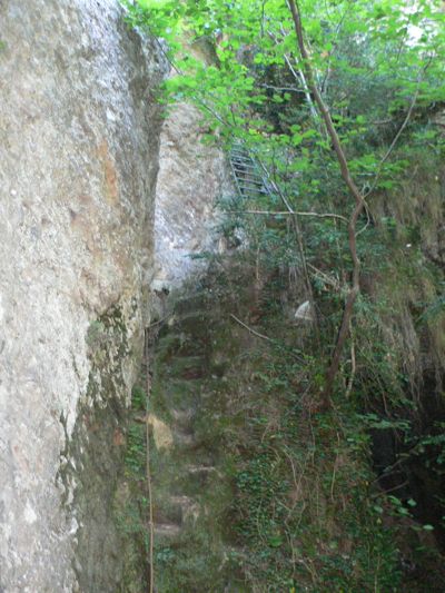 El paso más reseñable de todos es sin duda el Graell de Cal Pigot. Subiremos por una escalera tallada en la roca ayudados por una cuerda que nos dejará junto a una inestable escalera metálica. Ésta termina al pie de una cascada y a una obertura en la roca, único paso natural para acceder a la parte alta del risco. Un paso sorprendente y único por ingenioso e inesperado, donde realmente es difícil adivinar desde abajo por donde transcurrirá.