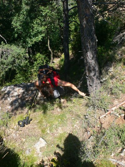 El paso del Grapissot es apenas vertical, nos permite descender asegurados un corto desnivel, que bajaremos a pie por encima de unos troncos instalados a modo de "pasarela".