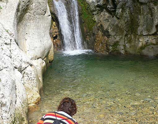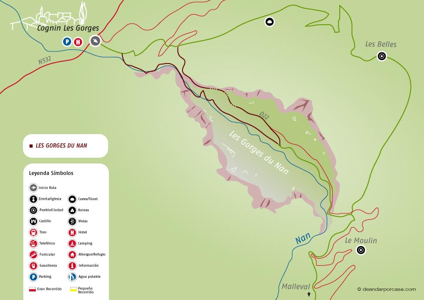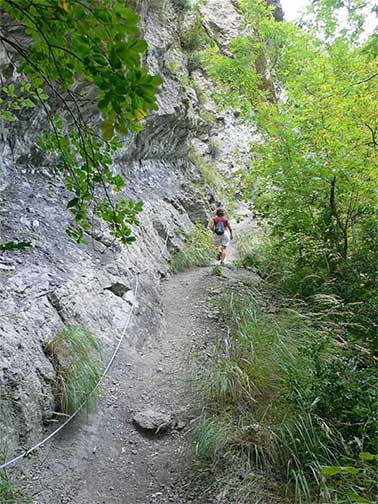 La ruta que os proponemos, sube por el interior de las gorgas en dirección a la carretera D22, literalmente excarbada en la roca a más 200 metros del río. El primer tramo de la ruta lo recorremos cerca del Nan, con sus saltos de agua y pozas cristalinas (1). La ruta, en un par de tramos equipada con cables, rápidamente empieza a subir y a medida que aumenta el desnivel, nos aleja del río (2)(3).