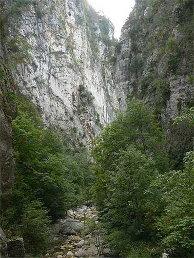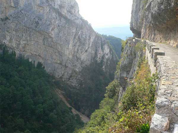Si continuamos de frente y recorremos la gorgas al completo podemos visitar Malleval, pueblo mártir de la Resistencia durante la 2 Guerra Mundial, pero nosotros optamos por desviarnos a la izquierda hacia la carretera. Pronto las vistas se despejan y nos encontramos en las escarpadas paredes del desfiladero.