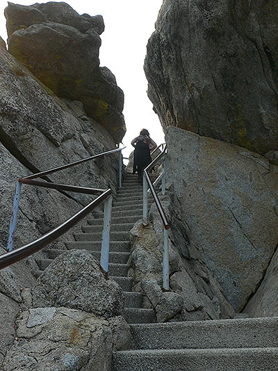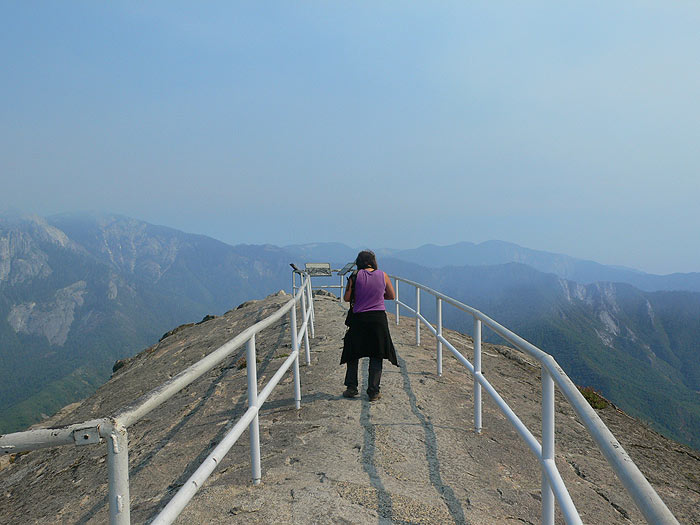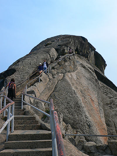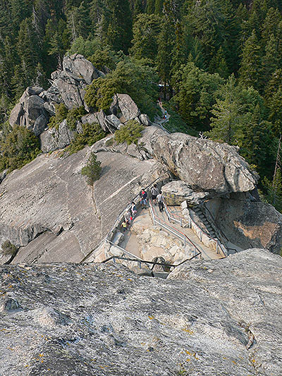 Después de varios cruces de caminos llegaremos al límite sur del Giant Forest, a nuestra derecha aparece la mole granítica del Moro Rock, nuestro siguiente objetivo. Avanzando hacia el oeste por el Sugar Pine Trail llegaremos a la base de la mole, condicionada con escaleras talladas en la roca por las que alcanzaremos la cima no sin esfuerzo. Moro Rock, 2.050 m.s.n.m, es un buen mirador de las cercanas montañas de la Great Western Divide.