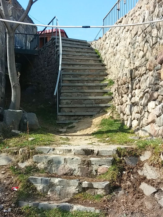 Seguimos el camino de subida que se vuelve empedrado (F. 29). Hay que girar a la izquierda cuando nos encontramos con esta escalera de piedra (F. 30). Al final de la escalera daremos con la mismísima entrada al templo (F. 31). Si se quiere acceder ésta es de las pocas atracciones turísticas en la que hay que pagar en toda Armenia pero merece mucho la pena.