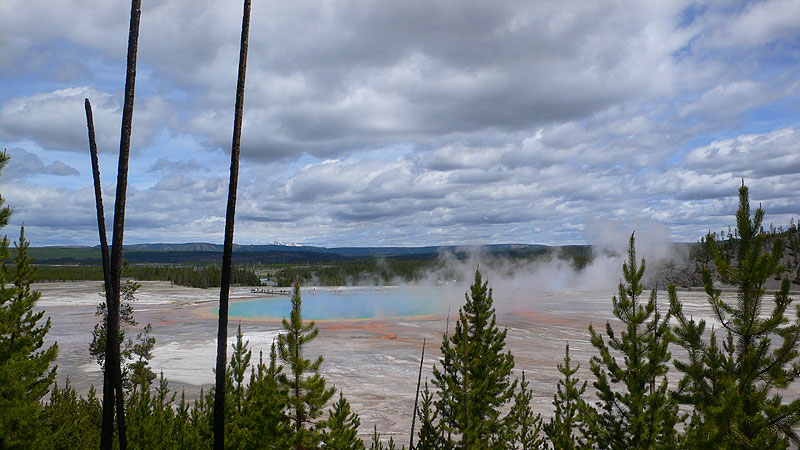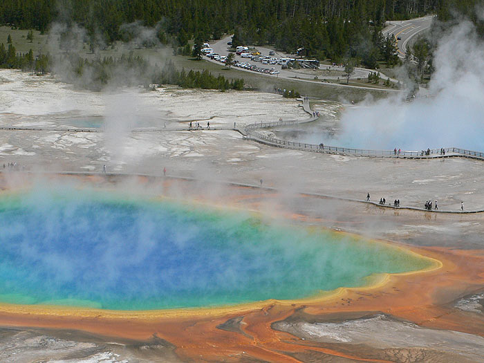 Antes de los feroces incendios de 1988 que afectaron un 36% del parque nacional, no había una buena vista aérea si no era sobrevolando la zona. Mientras el bosque se recupera, podemos subir una empinada loma, parcialmente despojada de árboles que nos ofrece una vista clara sobre toda la zona termal. Es una de las fotos que más anhelábamos de nuestra visita de Yellowstone y la que quedará en nuestras retinas gravada para siempre. Ninguna otra piscina termal del parque tiene el tamaño ni los vibrantes colores del Grand Prismatic.