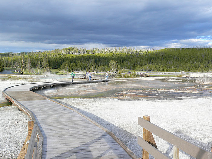 Old Faithfull y Biscuit Basins son zonas muy concurridas especialmente la parte más cercana a Old Faithful Inn donde es fácil ver a familias saliendo preparados para una sesión de footing o para dar una vuelta en bicicleta. Es un ambiente muy familiar.