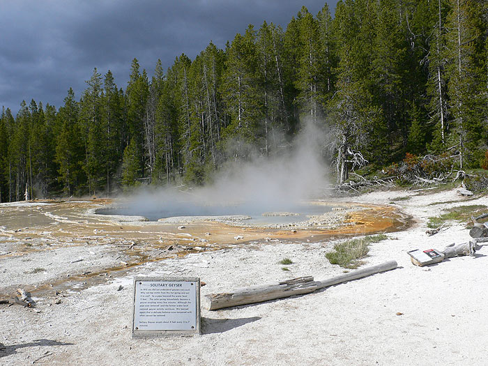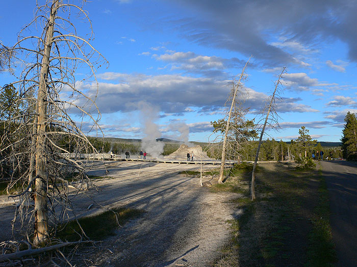 Casi desde el mismo estacionamiento podemos ver uno de los espectáculos más visitados del Parque de Yellowstone, la erupción del géiser Old Faithful. ¿Porqué es tan popular este géiser? Como su nombre indica -el viejo Fiel- lo es por su puntualidad eruptiva que se mantiene a lo largo de los años y no tanto por su altura, nada despreciable -más de 70 metros-