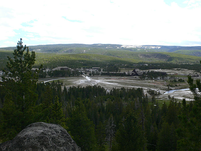 La explanada del Old Faithful desde el mirador Observation Point. El Old Faithfull está en reposo.