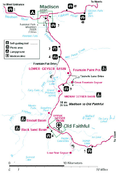 La vía más rápida es el acceso por la entrada sur del Parque Nacional de Yellowstone la carretera 89 que sube desde la población de Moran y luego sigue por el Grand Loop Rd.