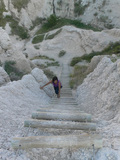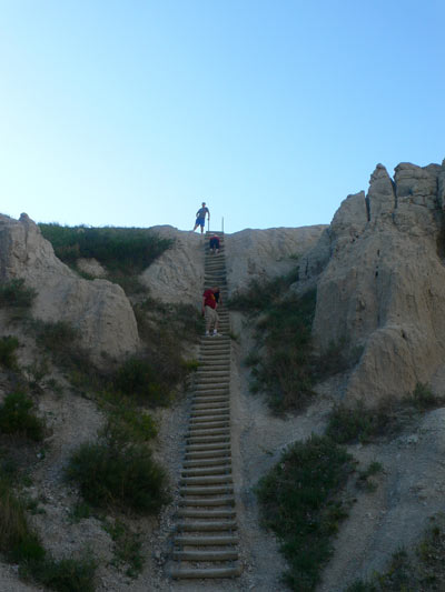 Avanzando por un estrecho cañón llegaremos a un anfiteatro con una única salida, una inclinada escalera equipada que nos permitirá alcanzar un balcón superior. El balcón a modo de cornisa - ojo que es estrecha - nos llevará hasta el final del sendero marcado, un extenso mirador a las praderas del sur de las Badlands.