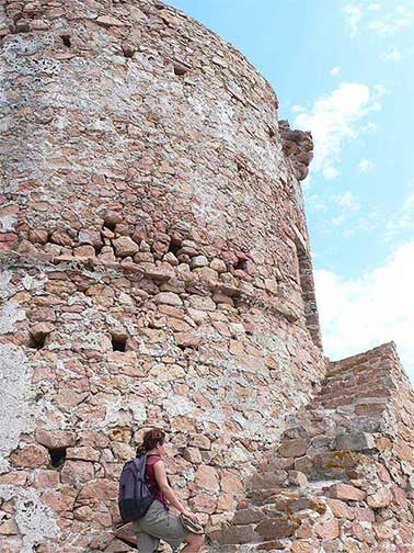 El camino es duro, pues la vegetación de arbustos mediterráneos (maccia) es muy baja y el sol azota sin tregua. Contados son los árboles en donde nos acoge una sombra y además plagados de gente, lo mejor es llevar mucha agua y no olvidar el gorro. Rodeamos la montaña, siempre acompañados de las omnipresentes vistas al mar y atacamos la subida al cabo por la vertienete oeste, una canal de roca granítica y rosácea que debemos subir como si fuese una gran escalinata. Un poco más arriba zigzagueamos por un camino indistinguible señalado con hitos.