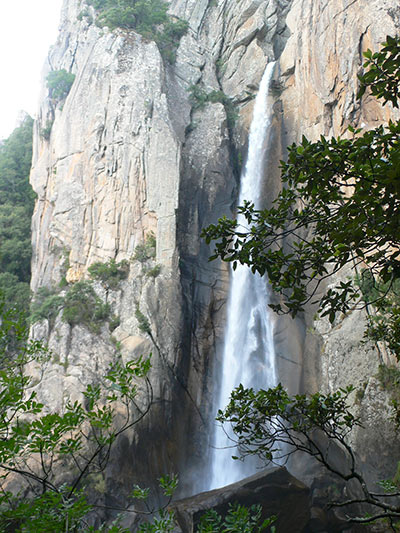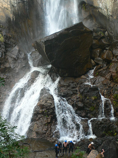 Después de una ligera bajada entre pinares y un camino poco definido alrededor de las altas rocas de las que nace la cascada, se llega al punto culminante del descenso. Señalizado como no recomendado (no es recomendable para niños), este tramo final es resbaladizo y un poco peligroso, pero es la única manera de llegar a la base de la cascada, buen sitio para poder verla completamente.
