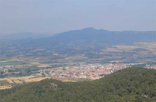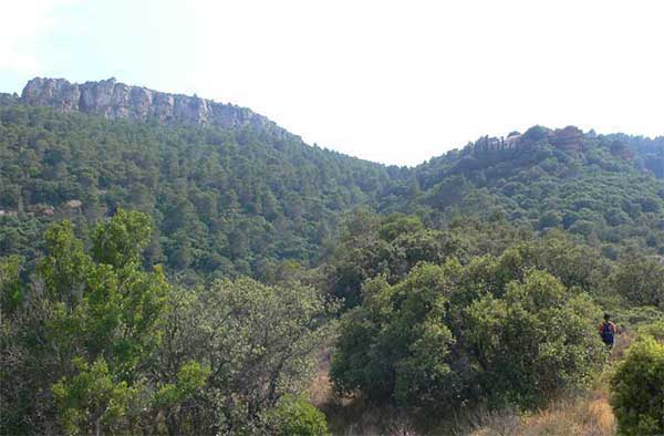 A lo lejos divisamos el techo de la ermita, junto al mirador y a la izquierda 'El Cingle Blanc de St. Joan' formación rocosa que preside la montaña y por la que discurre una pequeña vía ferrata, La Feixa del Colom.