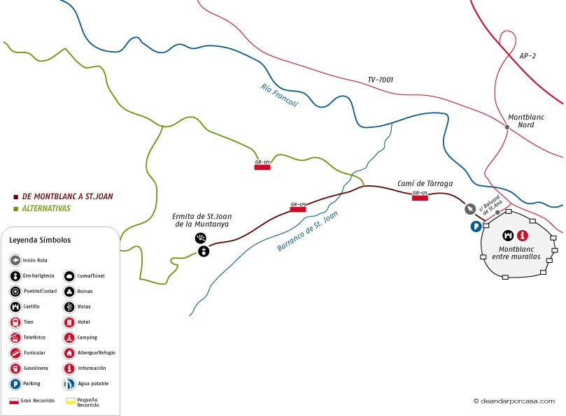 Por la AP-2 dirección Lleida -Zaragoza, salimos a la altura de Montblanc y tomamos la N-240. En la rotonda cogemos el desvío Montblanc Nord. Pasado un puente tomamos la primera calle a la derecha, Baluard de Santa Anna y avanzamos con la muralla a nuestra izquierda. Antes del final de la muralla y justo después de una bajada veremos el desvío a la ermita de Sant Joan y GR a nuestra derecha.