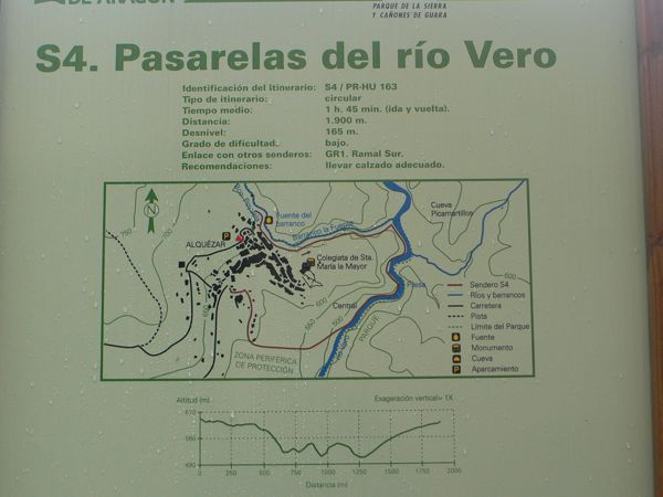 Desde Alquézar parten varios caminos que acaban de un modo u otro en el fondo del cañón del Vero. El camino de las pasarelas es el más accesible y directo pues desciende por el pronunciado barranco de la Fuente casi sin rodeos hasta el lecho del río. Para ello se han instalado numerosos puentes y barandillas que facilitan el paso, pudiéndonos concentrar más en el paisaje que en el propio camino. El acceso a dicho barranco, está bien señalizado en la calle de la Iglesia - S4.PR marcas amarillas y blancas - justo en frente de la tienda "O Forno". De este primer tramo de descenso lo mejor son las vistas a la Colegiata que se alza imponente en el espolón y la frondosa vegetación que poco a poco va cubriéndolo todo.