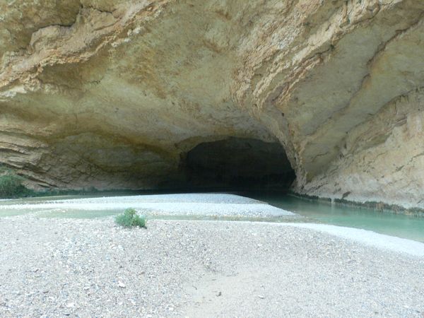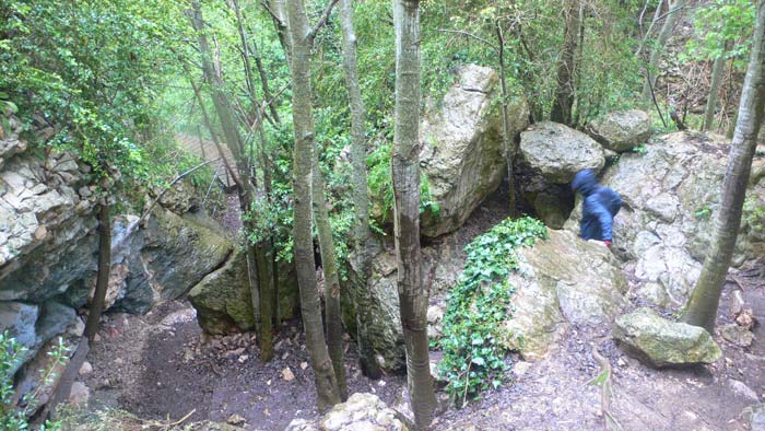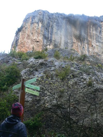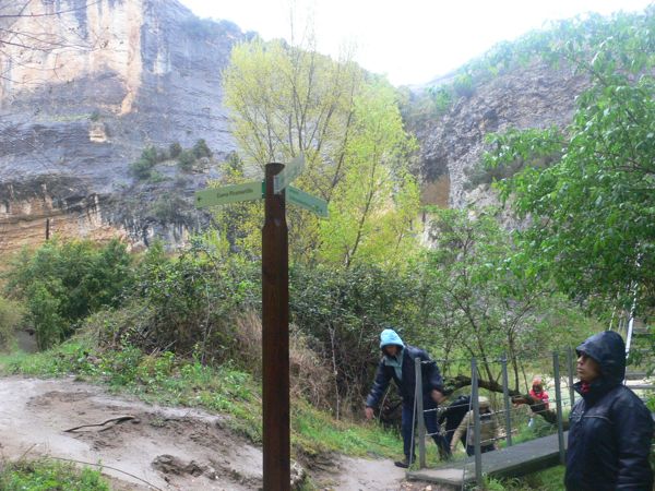 Al llegar al Vero la vista se despeja y tenemos ante nosotros amplios paredones de sinuosas formas, uno de los símbolos de Guara. Es de visita obligada la cueva de Picamartillos, a la izquierda, que domina esta parte del curso del Vero cubriéndolo en su mayor parte como un techo natural. Damos media vuelta y seguimos el camino por una pasarela clavada en la roca que nos permite sortear el cauce. Entramos en la parte más bonita y encajonada del cañón donde se suceden las pasarelas y pasamanos, único acceso posible para llegar hasta aquí sin mojarnos.