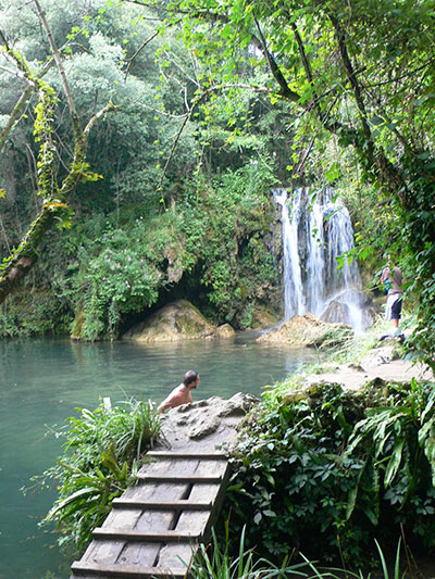Después de descender a la riera ascendemos un corto tramo de pista y pronto tendremos a nuestra izquierda el salto de agua del Molí dels Murris. Podemos quedarnos aquí y disfrutar de un buen baño, que es de hecho el objetivo de la excursión. La mejor zona para hacerlo se encuentra cerca del salto, el agua es más clara y el fondo de piedras es visible.