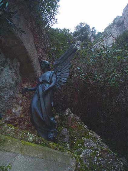 Bajando por unas inclinadas rampas (3) (4) nos iremos encontrando con los misterios del dolor y del gozo de Jesucristo representados en esculturas de fines del siglo XIX. Además de las estatuas religiosas, nos acompañará también un olor nada espiritual de aguas empozadas que contrasta con la limpieza de las esculturas. Dicho sea de paso, como la mayoría de iconos religiosos, estas estatuas son angustiosas, excepto claro la de la virgen María en su ascensión al cielo (5).