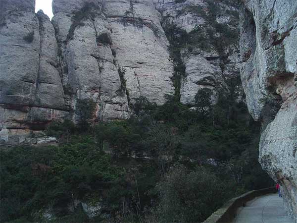 El paisaje es diferente al de las rutas que nos llevan a Sant Jeroni u otros picos, es más bien una vista de las paredes frontales y del Torrent de Santa María. Las paredes nos recuerdan los desprendimientos del año 2000 producidos por la intensa lluvia y el contraste de colores de la roca nos permite acusar la historia de éstas paredes. En una de ellas se puede ver la huella de los incendios de 1994 que terminaron con casi todos los pinos y las encinas. Pajarillos y lagartijas utilizan como nosotros el camino y luego se introducen en el bosque.